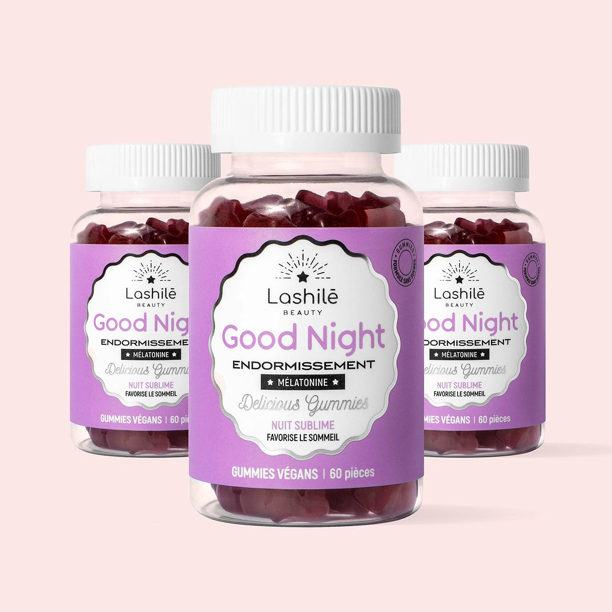Agent de charge : maltitol - Acidifiant : acide citrique - L-Théanine - Gélifiant : pectine - Extrait sec de partie aérienne de passiflore (Passiflora incarnata L.) - L-Tryptophane - Extrait sec de racine de valériane (Valeriana officinalis L.) - Arôme naturel - Acidifiant : citrate de sodium - Concentré (carotte et cassis) - Agent d’enrobage : cire de carnauba - Chlorhydrate de pyridoxine (vitamine B6) - Mélatonine - Acide ptéroylmonoglutamique (vitamine B9).