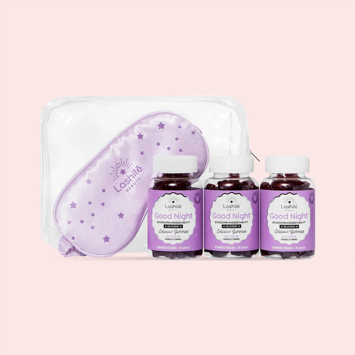 Agent de charge : maltitol - Acidifiant : acide citrique - L-Théanine - Gélifiant : pectine - Extrait sec de partie aérienne de passiflore (Passiflora incarnata L.) - L-Tryptophane - Extrait sec de racine de valériane (Valeriana officinalis L.) - Arôme naturel - Acidifiant : citrate de sodium - Concentré (carotte et cassis) - Agent d’enrobage : cire de carnauba - Chlorhydrate de pyridoxine (vitamine B6) - Mélatonine - Acide ptéroylmonoglutamique (vitamine B9).